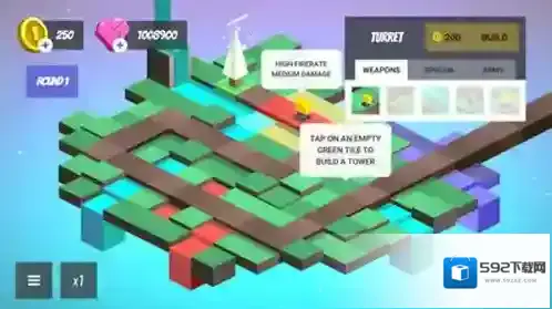 1、点击【BEGIN-ROUND】前,用金币在绿色空地建【TURRET】,布置防御塔迎敌。