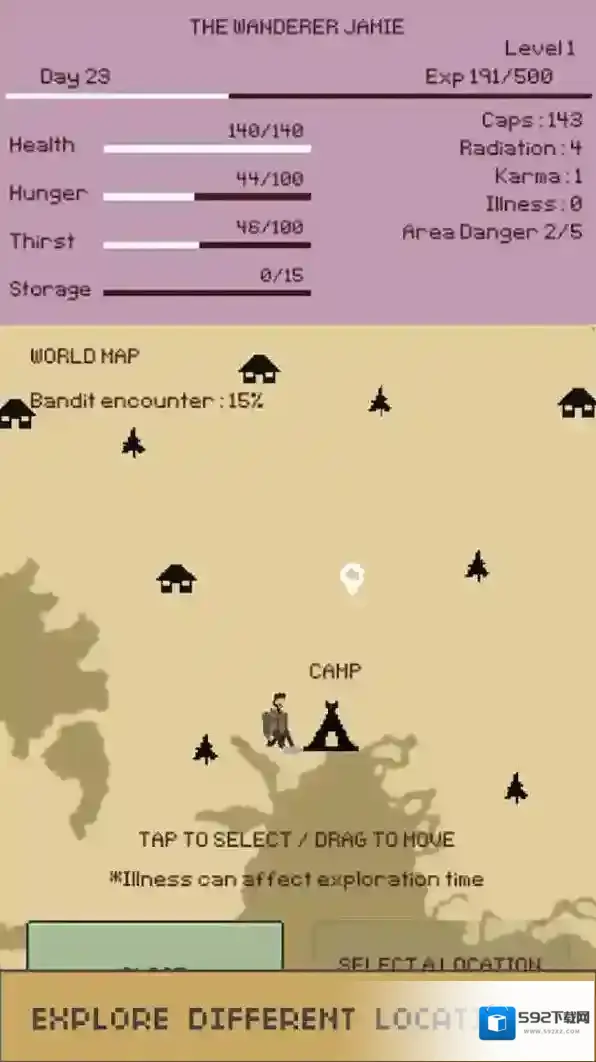 3、在营地,点击休息到第二天,恢复状态,推进Day1进程,积累Survivor-Points,发展角色。