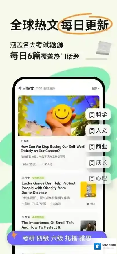 文章的重点单词、各类考试(四六级、考研、托福GRE雅思等)的难点单词,都会由系统高亮展示,帮助你查缺补漏。