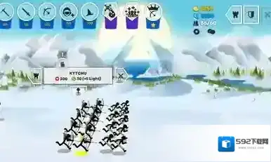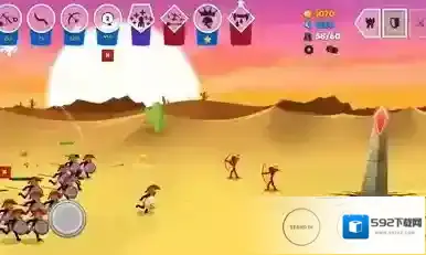 2、本关只要坚持四分半就可以结束,开局先一直召唤矿工和剑士,然后优先让矿工采集金块,当对面来进攻时就全体回撤,让城堡弓箭手来解决对手。