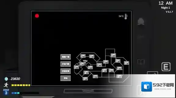 3、正式开始后左边控制角色移动,滑动屏幕可以控制转向,右边是互动、手电、奔跑按钮,点击向下的箭头可以打开平板查看不同的房间。