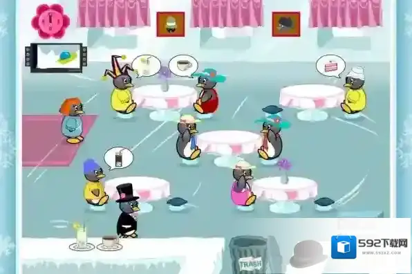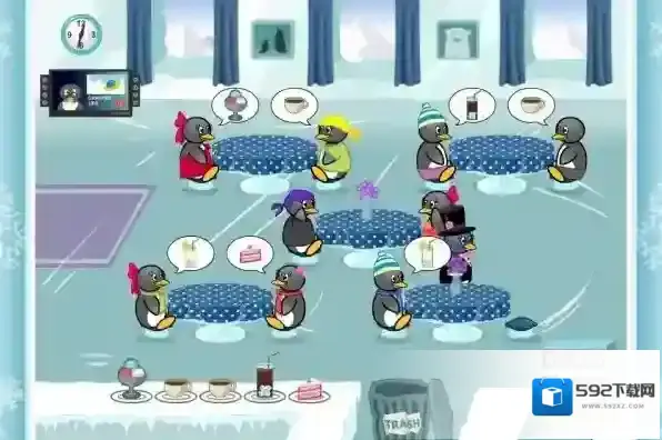 1、日常经营操作:玩家需点击顾客快速安排就座,顾客招手时及时上前点餐,随后操控企鹅员工取餐上菜,全程考验手速与反应力。