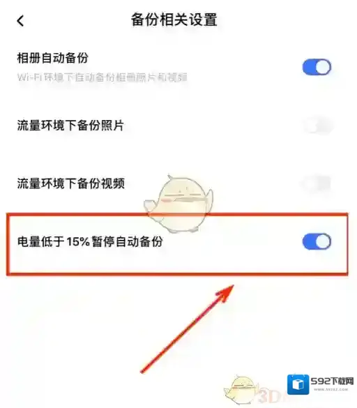 4、最后在备份设置界面,把电量低暂自动备份按钮打开即可。