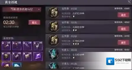 黄金挂机有多个层数可供选择,角色等级越高,可以选择挑战的层数就越高,每层都有不同等级的刷怪区域,怪物等级越高,玩家获取的经验就越多。