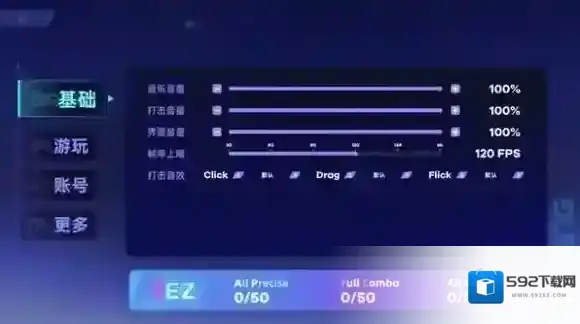 4、在设置面板中可自定义音乐音量、帧率上限及打击音效等参数。