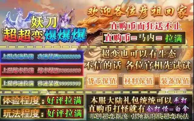 妖刀超超变爆爆爆,195神器高爆单职业版本,零氪到底,白嫖到终极!上线攻速、爆率、移速直接拉满,打怪就能赚取直购币,可以兑换礼包,时间证明一切!本服所有大陆礼包统统可以靠打获得,并且货币、材料和装备全部都很保值,支持玩家之间自由交易,绝对的生态大服!来这里天天领充值,免费轻松过关,白嫖即可到终极,绝对让你玩的爽爽爽!