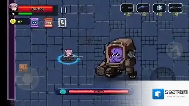 生命值9999,两种攻击模式:①发射环形弹幕 ②翻滚冲撞(参考小紫球,伤害50),翻滚后概率召唤小紫球。推荐用弓箭攻击(易瞄准、伤害高),注意其翻滚速度超过玩家移动速度,需及时闪避。击败后掉落狙击枪,出现关卡2-8。